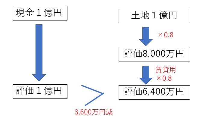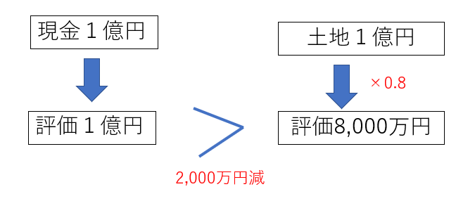 一般に路線価で計算された評価額は実勢価格の8割ほどとなるため、1億円(評価額1億円)を現金で相続するよりも、その1億円で1億円の土地(評価額約8,000万円)を購入した方が、相続税は少なくなるというわけです。