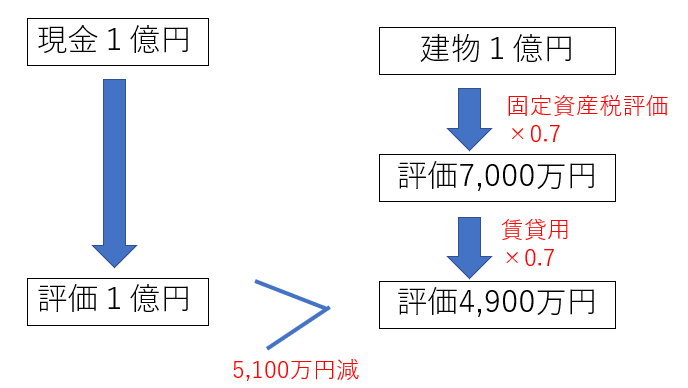 さらに賃貸住宅であれば貸家としてそこからさらに3割程度減額がされます。1億円で建物を建てたとすると、多く見積もっても1億円×7割×7割で4,900万円程度が評価額となります。
