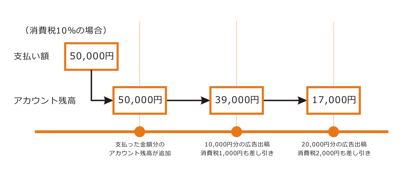 上図のように、アカウント残高からは利用した広告料に加え、その広告料にかかる消費税分も差し引かれます。