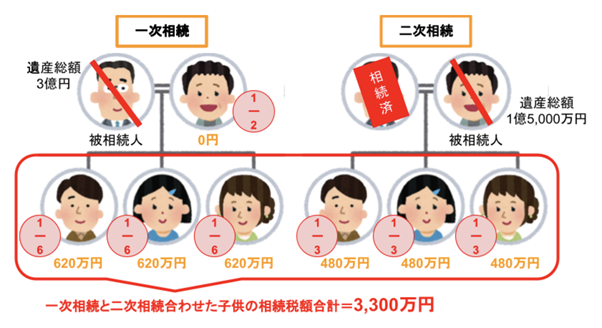 つまり、一次相続で配偶者がどのくらい相続するかによって、子供の相続税額が変わるのです。