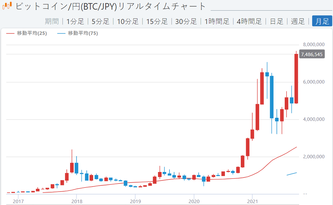 2020年の9月まで100万円付近を推移していたビットコインは、2021年10月には700万円の大台を超え、史上最高値を更新しています。テスラなどの著名企業や投資ファンドが大量購入しているだけではなく、中米のエルサルバドル国で、ビットコインが自国通貨に採用されていくなど実需により価格が上がっていっているのが最近のビットコイン相場です。