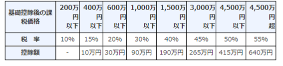 上表の税率は110万円の非課税枠を控除した後の金額で税率にかけ合わせて計算します。