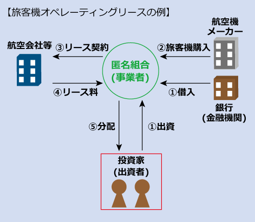 オペレーティングリースとは、航空機、船舶、コンテナなどへ出資し、匿名組合と呼ばれる事業者を通じて航空会社等へ貸出を行うスキームのことです。節税を考えている事業者は出資者としてこのスキームに参加することで、初年度に数千万単位の損金計上(節税)を行うことができ、またリース期間終了時にはリース商品が売却され、その収益を分配金として受け取ることができます