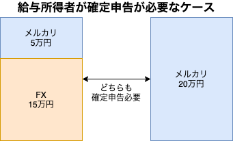 しかし、メルカリの他にも15万円FXでの収入があった場合には、給与所得と退職所得以外の所得の合計が20万円となることから、確定申告の必要があります。