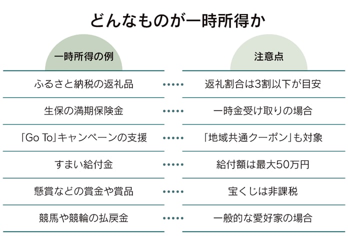 オンラインカジノの収益は「一時所得」に分類されます。一時所得とは、給与や不動産所得など定期的に受け取る所得ではなく、臨時的に発生した所得です。オンラインカジノの収益以外にも、下図のようなものも一時所得に該当します。