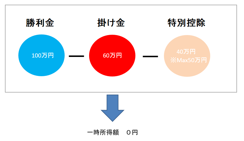上記の通り、年間を通して200万円の勝利金(収入金額)を得ました。一方、200万円の勝利金を得るためにベットした金額(支出金額)は、計100万円です。よって、両者を差し引き、さらに特別控除50万円を適用すると、一時所得額は50万円となります。