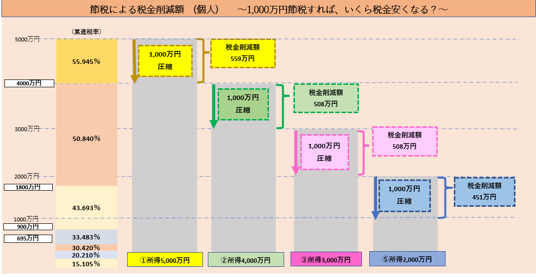 個人の税率は累進課税(一年間の稼ぎが増えるほど税率も高くなる)ですので、単年度に大きく利益を出さず、将来に薄く利益を繰り延べることできちんと納税しつつ税金を低く抑えられます。