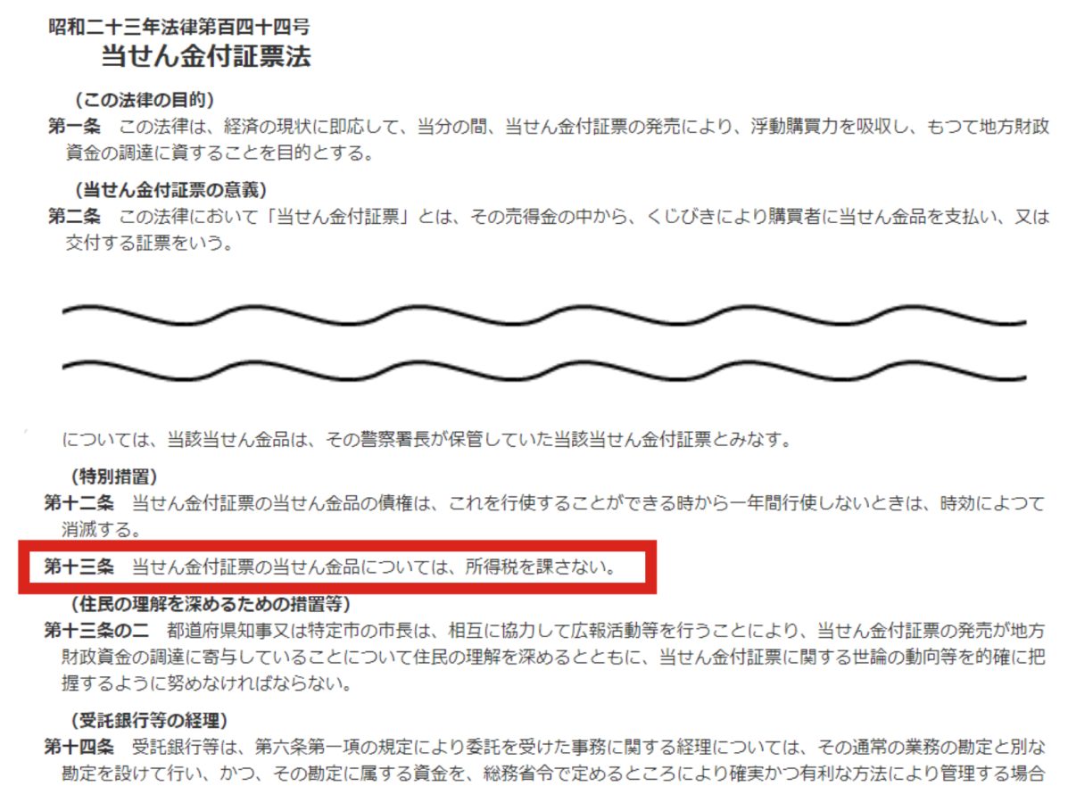 宝くじの販売などの規制を定めた「当せん金付証票法」の第13条において、「当せん金品については、所得税を課さない」と記載されています。よって、宝くじには税金が発生しないのです。