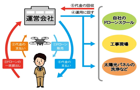 つまりは、節税したい会社がドローンに投資(オーナーとなる)し、 それをスクールなどに一括で貸し出すことで 利回りを得るスキームが「ドローン節税」の概要となります。